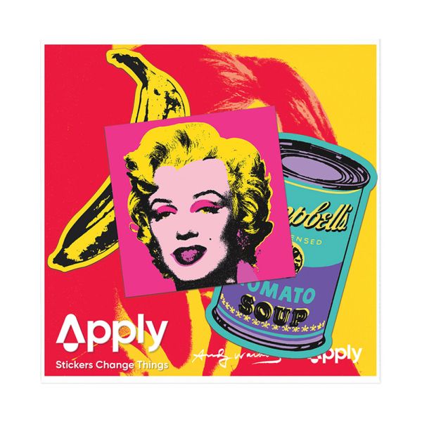 Iconic Warhol paintings from the 1960s - a turquoise Campbell's Soup Can; bubble gum pink Marilyn Monroe; and the infamous Banana. Silkscreened then and now, available as stickers.