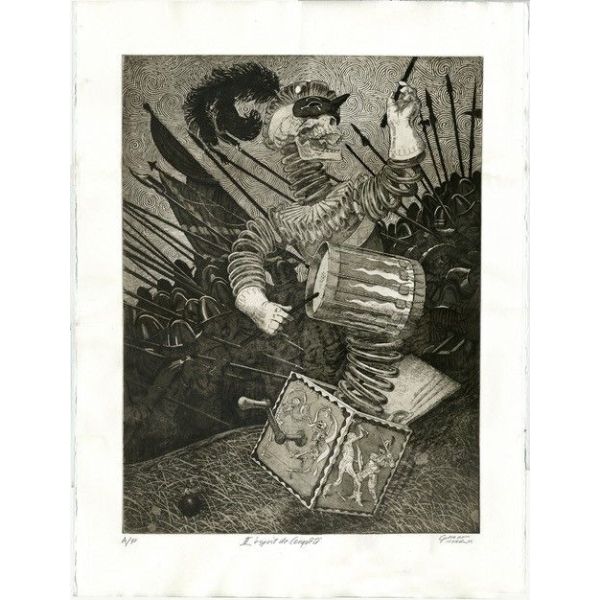 In the 16th century, armies marched across the European continent, competing for scraps of land usually at the cost of the civilian populations that lived there. L'esprit de Conquête is a French term that reflects the glory and to cost of war my way of a jack-in-the-box metaphor. In this editioned aquatint etching, the “drums of war” played by the central character hint at the real tole of mens’ military ambitions.