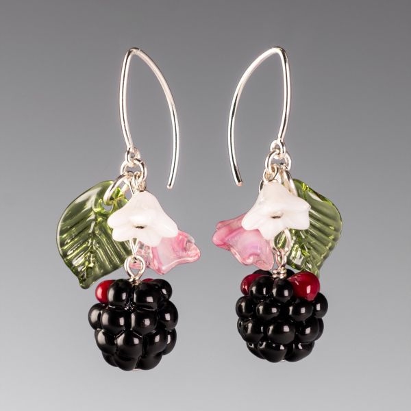 Lampworking (also called Flameworking) is the process of sculpting glass in the 4000F flame of an oxygen propane torch. The Italian-made glass Elizabeth most often uses has a working range between 1,000F and 1,700F. In the upper part of that range, the glass can become as liquid as honey and must be constantly rotated to prevent it from dripping. Toward the lower end of the working range, the glass begins to solidify and develops plastic qualities much like clay or soft wax. The sculpture in progress must be moved back and forth in the flame to maintain it in that critical plastic temperature range. If the piece is allowed to get too hot, surface details will be melted away and the sculpture spoiled. If it is heated unevenly or cools too much, the sculpture will shatter apart, sending near-molten bits of glass in all directions. Each flameworked object Elizabeth makes is hand-sculpted; therefore no two are ever exactly alike. Variations in the surface color are achieved by carefully controlled heating and cooling, by mixing several glass colors together, or by applying vitreous enamel, which is finely powdered glass. When enamel is used, it is completely fused into the sculpture and will not fade or flake off. Any stems, such as those on cherries, are embedded into the glass and are made of solid copper wire that is unfinished or has an oxidized patina. No paint is applied to any of the objects.