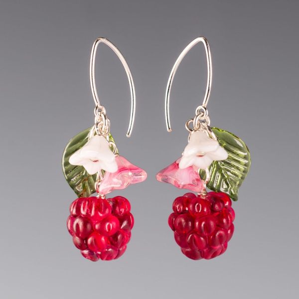 These red raspberry earrings are made from realistic hand blown glass raspberries and light or dark green glass leaves, along with some pressed glass blossoms for a pop of spring color. All are hung on Sterling Silver ear wires. The raspberry beads on these earrings are each about 1/2 inch (12mm) high.