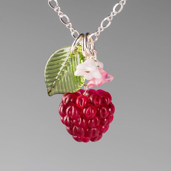 Glass Raspberry Necklace features one handmade glass raspberry bead, one hand blown glass leaf, and a couple of pressed glass blossoms for a pop of spring color. The raspberry is life-sized (just over 5/8 inches high). All are hung on sliding rings and suspended from an ADJUSTABLE length figure-8 chain in Sterling Silver. The chain will be either 20 inches overall, but you can wear it at any length you please by clipping the lobster clasp into any large link of the chain. The free end of the chain is decorated with a matching glass leaf.