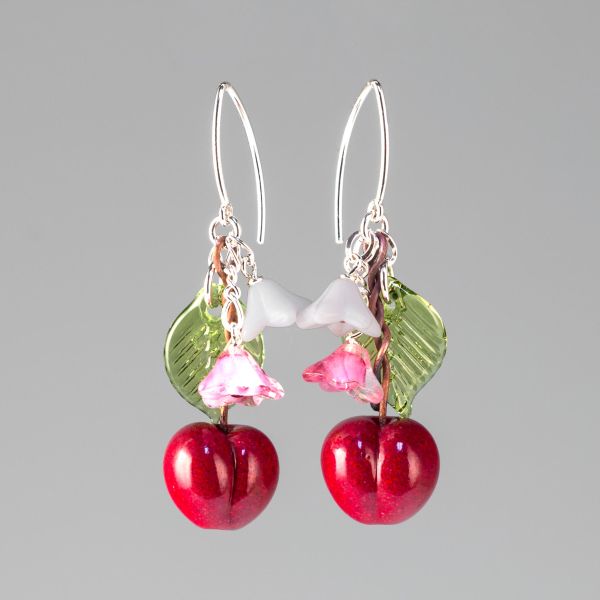 Glass Botanical Red Cherry Earrings on Sterling Silver.