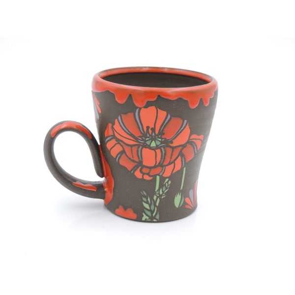 "Poppy" Ceramic Mug Approximately 4 1/2" Height x 3 3/4“ Diameter x 1 3/4" Handle Microwave and Dishwasher Safe. Holds 14 oz.