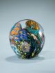 With a jazz-like sense of improvisation, Michael composes graphite molds from a large and growing library of interchangeable hand cut components. No two compositions are ever alike. After Michael prepares his unique mold compositions, he starts each blown form by capping the blow pipe with colored glass. He then "gathers" successively thicker layers of molten clear glass from the furnace until he has enough to fill the mold.