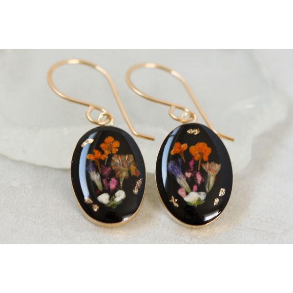 Using a multimedia approach, Rebecca infuses real plants-many of which she grows and dries-epoxy clay, and the subtle shimmer of mica powders, crushed glass, and metal leaf into her designs, all encased in crystal-clear resin. This resin, carefully degassed to ensure perfection, encases each element in a lustrous, high-polished finish. The creation of handmade ear wires from sterling silver and gold-filled wire for her dangle earrings exemplifies her commitment to detail and the wearer's comfort. The final effect of each piece results in an aesthetic that is both earthy and ethereal.