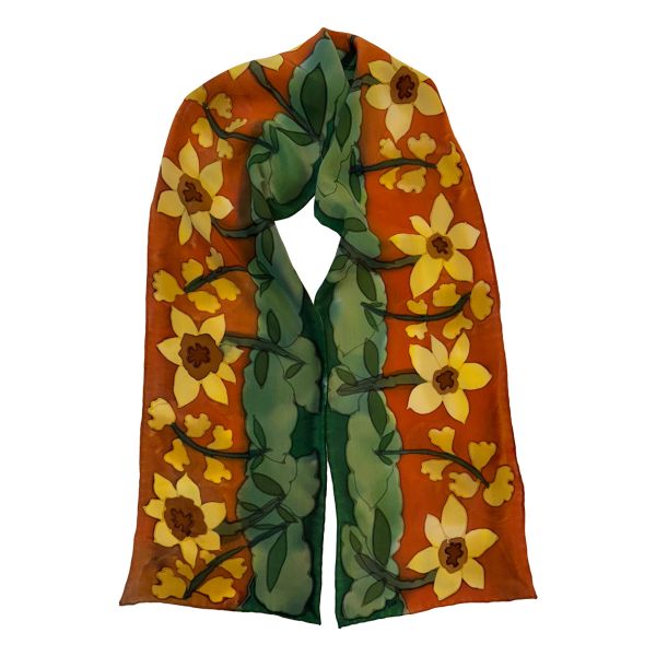 Susan Skove - "Crepe Orange Green Floral" Silk Scarf 8x54