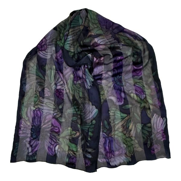 "Satin Stripe Violet Forest Floral" Silk Scarf 17" x 72".